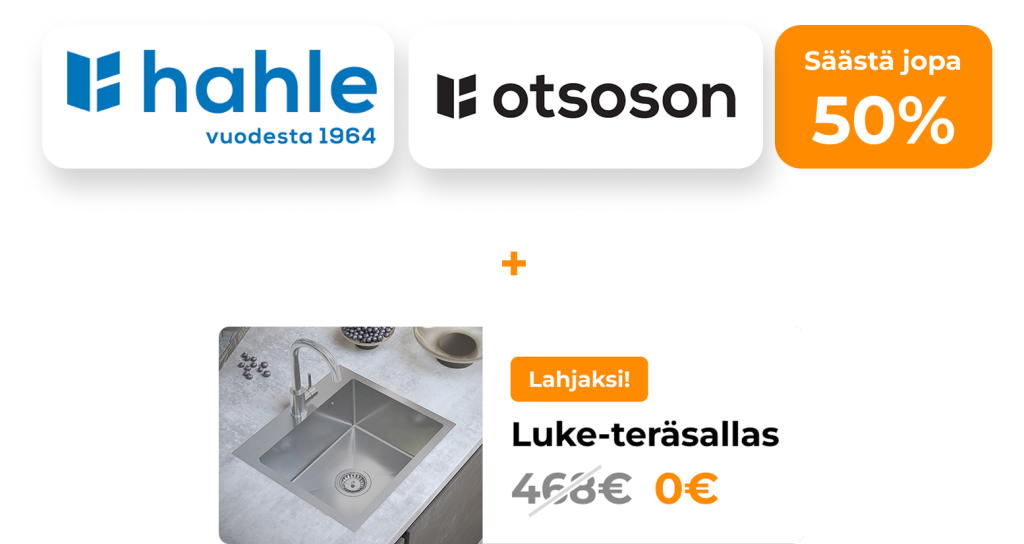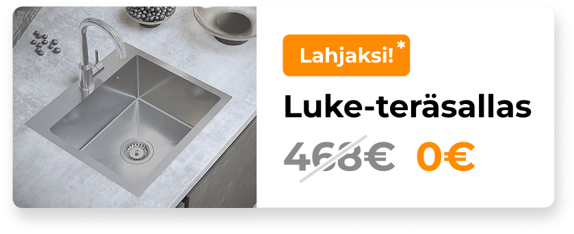 Voimassa 31.1.2026 asti Vuoden suurin keittiöale! Varaa suunnitteluaika -50% Altaat keittiöön tai kylpyhuoneeseen Otsoson-mallistosta Varaa suunnitteluaika -30% Kompaktitasot Hahle-mallistosta Varaa suunnitteluaika -30% Laminaattitasot Hahle-mallistosta Varaa suunnitteluaika Lahjaksi Keittiön ostajalle lahjaksi Luke-teräsallas Varaa suunnitteluaika *yli 3000€ tilauksiin